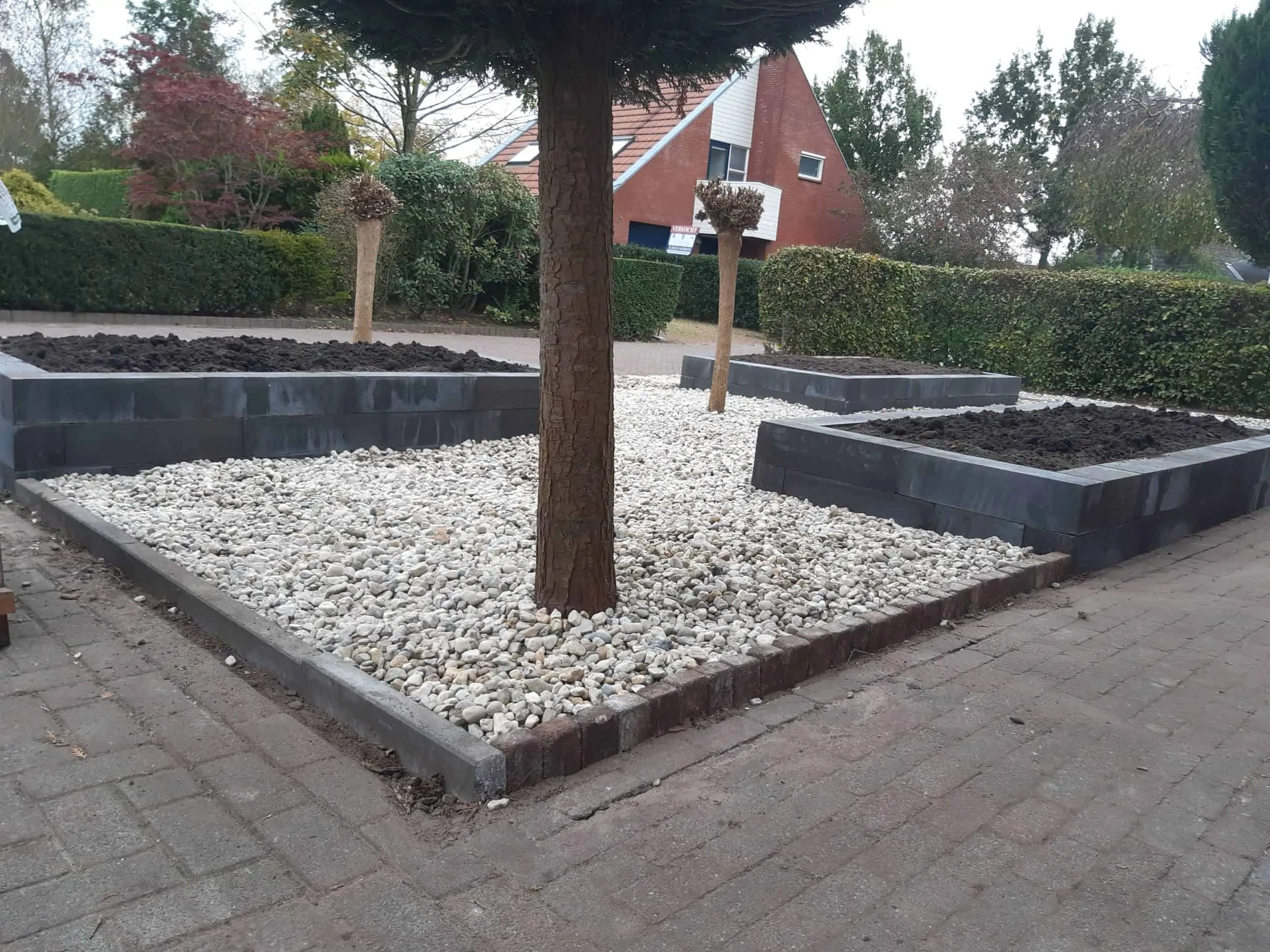 Onderhoudsarme voortuin van drie bloembakken omringd door grind.